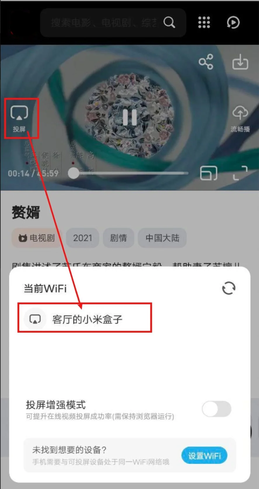 需要让当前手机和电视/盒子连接同一WIFI网络,否则可能无法搜到电视设备。